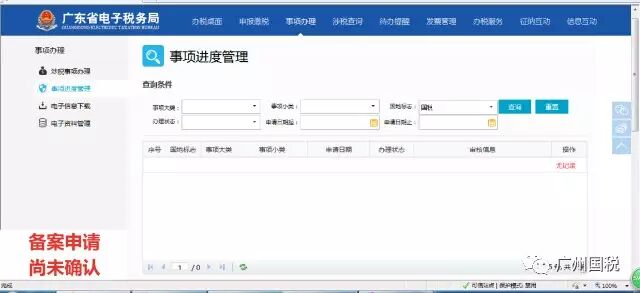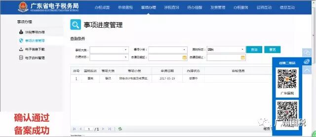 (2)税务部门确认。确认后即备案成功。纳税人可通过“事项办理→事项进度管理”,查看申请的办理进度。