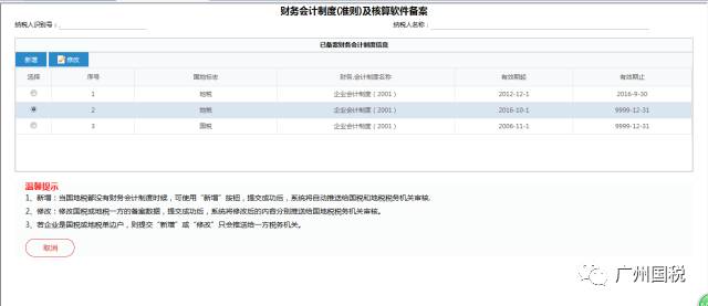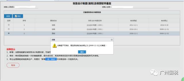 c. 查看国地税备案的有效期。“有效期起”的时间必须至少为申报期的上个月,如果在申报期后或同月,则无法申报(如当前是17年4月份,如果企业所得税主管方税务机关的财务会计制度备案“有效期起”为17年4月1日, 4月申报期并不会有财务报表应报送清册的,要到5月才进行报送)。如属于财务会计制度备案有效期错误,建议纳税人进入电子税务局(国税环境)进行修改,修改注意事项见问题3的解答。